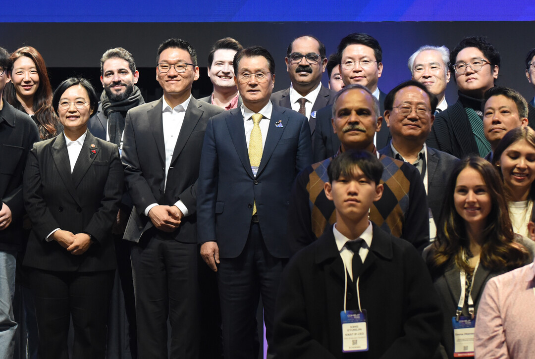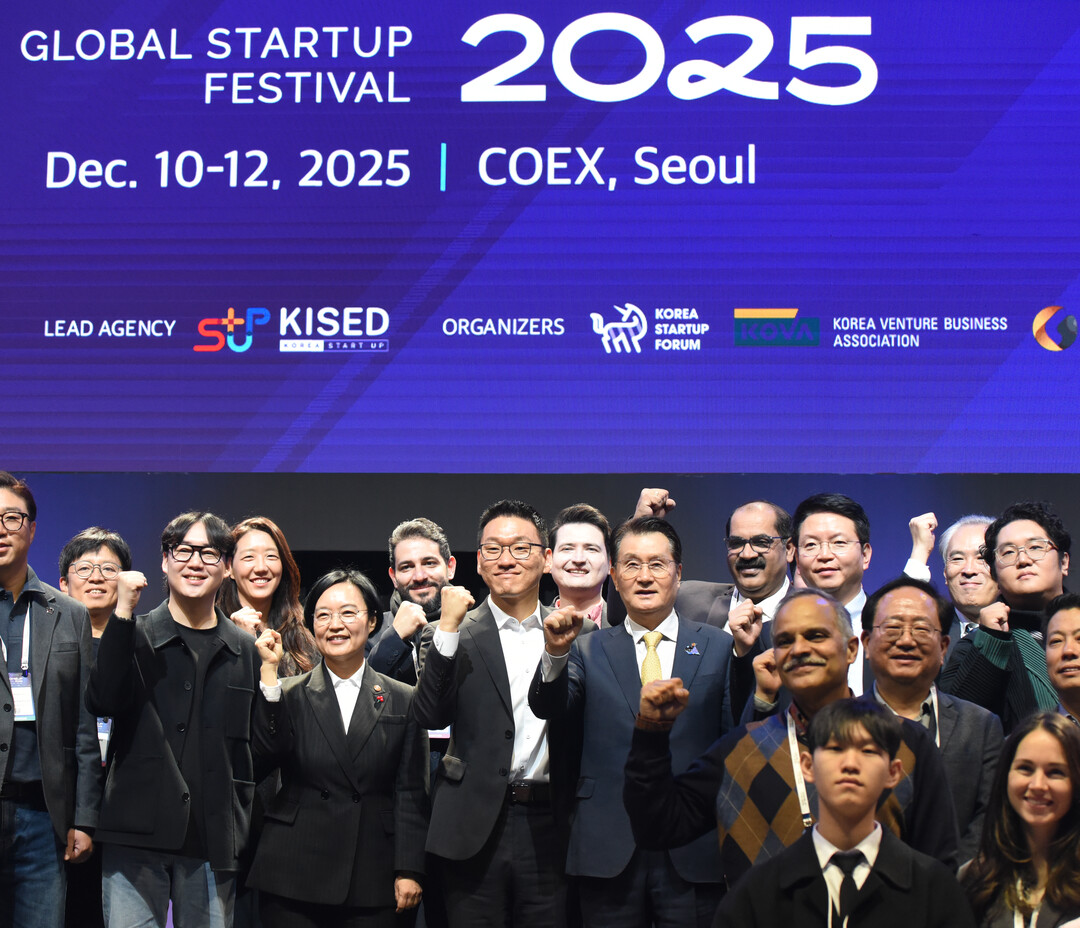 한성숙 중소벤처기업부 장관(맨 왼쪽 앞 줄)과 최용호 갤럭시코퍼레이션(오른쪽 초록색 의상) 대표가 10일 서울 강남구 코엑스에서 열린 국내 최대 규모 글로벌 스타트업 페스티벌인 '컴업(COME UP) 2025'에서 기념 사진을 촬영하고 있다.