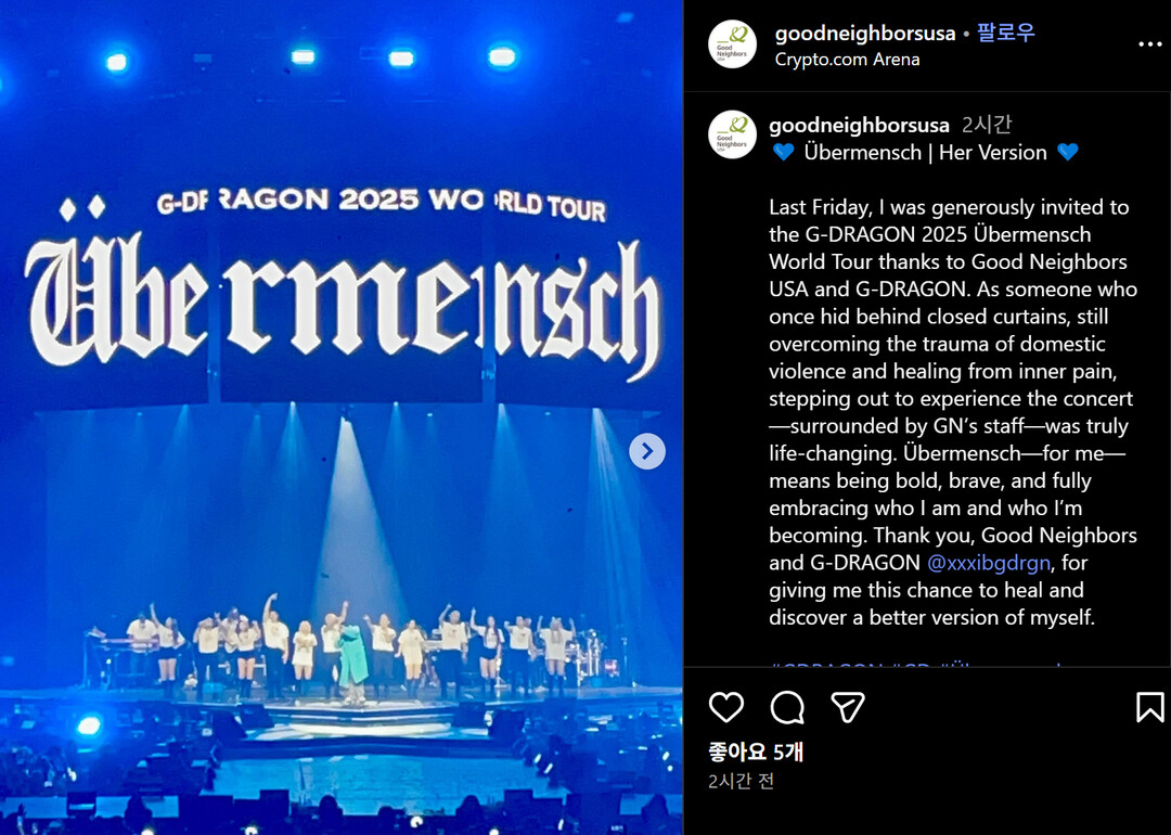 '굿네이버스 USA'는 인스타그램 등 SNS을 통해 "한때, 닫힌 커튼 뒤에 숨어 가정 폭력의 트라우마를 극복하고 내면의 고통에서 치유된 사람으로서, 굿네이버스의 스태프들과 함께 콘서트를 경험하기 위해 나선 것은 정말 인생을 바꾼 일이었다"라며 "우리에게 위버맨쉬는 대담하고 용감하며 내가 누구인지, 내가 누가 되어가고 있는지 완전히 포용하는 것을 의미한다"라고 이번 초청이 이들에게 갖는 의미를 설명했다. 이어 "치유하고 더 나은 모습을 발견할 기회를 주셔서 감사드린다"라고 지드래곤과 재단 측에 감사를 전했다.