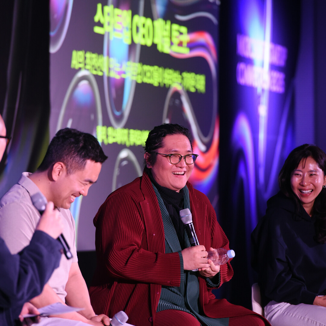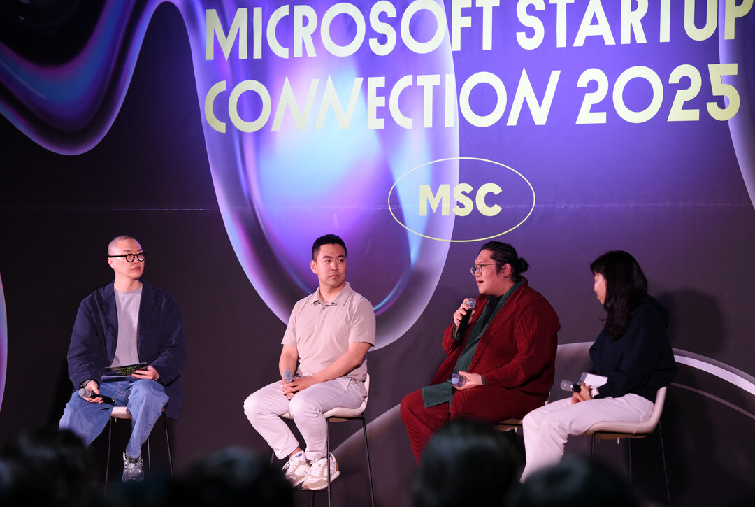 최용호 갤럭시코퍼레이션 CHO(최고행복책임자, Chief Happiness Officer)가 25일 오후 서울 강남구 코엑스에서 마이크로소프트 주최로 열린 '마이크로소프트 스타트업 커넥션(Microsoft Start-Up Connection)'에서 'AI 최전선에 있는 스타트업 CEO들이 바라보는 가까운 미래'라는 주제로 패널 토크를 진행, 업스테이지 김성훈 대표, 컬리 김슬아 대표가 경청하고 있다.