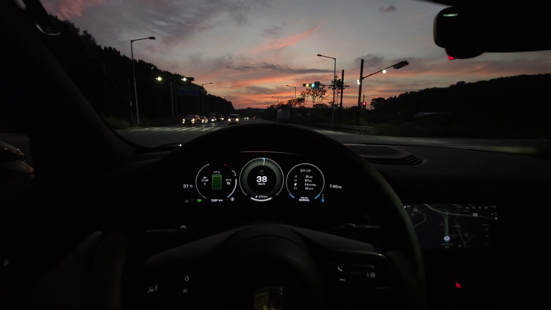 온몸을 꽉 잡아주는 느낌을 받습니다. 시동 버튼을 누르면 요란한 엔진음 대신 미래적인 '징~' 하는 전자음과 함께 차가 깨어납니다. 여기서 고성능 내연기관 포르쉐의 엔진음과 배기음에서 오는 감성적인 만족감은 기대하기 어렵다는 점은, 순수 전기차만이 가질 수밖에 없는 숙명적인 단점이겠지요.