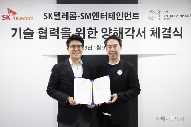 SK텔레콤은 9일(현지시간) 세계 최대 IT·가전 전시회 ‘CES 2019’가 열린 미국 라스베이거스에서 박진효 SK텔레콤 ICT기술센터장과 김영민 SM엔터테인먼트그룹 총괄사장이 만나 ‘기술 협력을 위한 양해각서(MOU)’를 체결했다고 밝혔다.