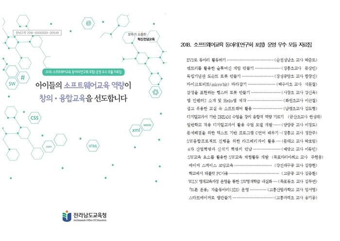 전라남도교육청(전라남도교육감 장석웅)은 ‘소프트웨어교육 학생동아리/교사연구회 우수 자료집’을 제작해 SW교육 선도학교, 희망학교 등에 보급했다.