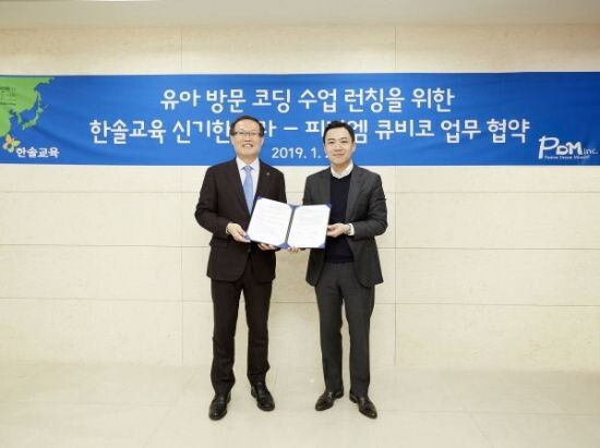 영유아교육 전문기업 한솔교육(대표 변재용)이 코딩교육 전문기업 피디엠(대표 박대민)과 유아 맞춤형 코딩 방문교육 서비스 ‘신기한 나라 코딩 큐비코’의 런칭을 위한 업무협약을 29일 체결했다고 밝혔다.