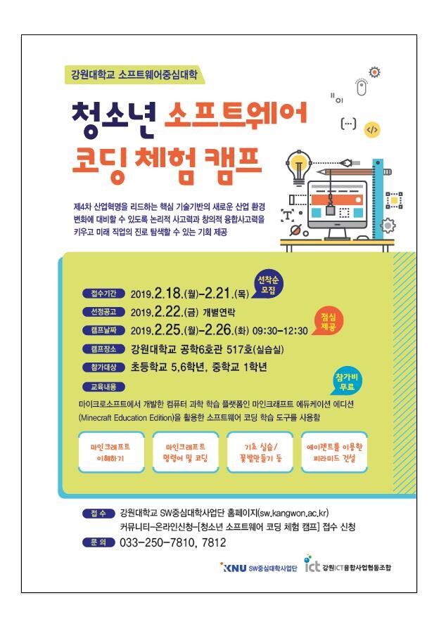 강원ICT융합사업협동조합(이사장:유지대)은 강원대 소프트웨어중심대학 사업단(단장:김진호)과 함께 도내 청소년들을 대상으로 소프트웨어(SW) 코딩(Coding) 체험 캠프를 개최한다고 20일 밝혔다.