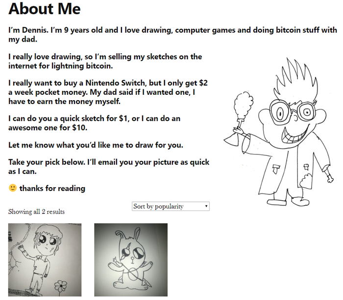데니스의 웹사이트에 따르면 데니스가 좋아하는 것은 그림 그리기, 컴퓨터 게임, 아빠와 비트코인 하기 등이며, 특히 300달러 상당의 닌텐도 스위치를 사고 싶어한다. 하지만 데니스는 아빠가 직접 돈을 벌어서 사야 한다고 하자 그가 좋아하는 그림을 그려서 팔기로 했다. 그는 두 가지 종류의 스케치를 팔고 있는데, 하나는 1달러의 간단한 스케치이고, 또하나는 10달러의 프리미엄 스케치(Awesome sketch)이다.