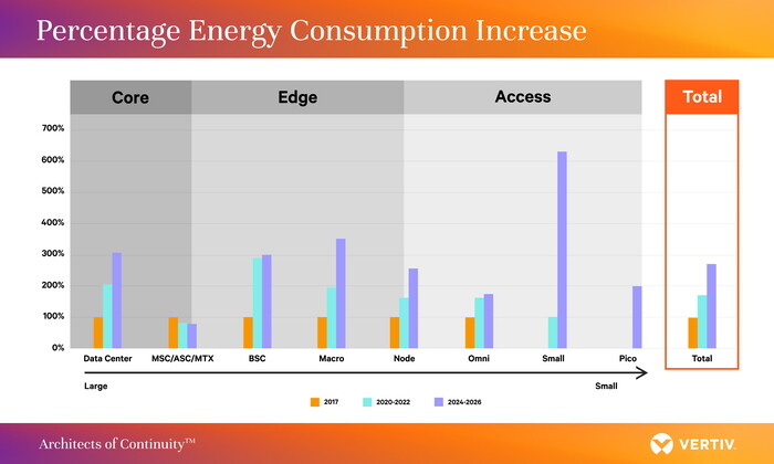 하지만 90% 이상의 응답자들은 5G 기술로 인해 에너지 비용 부담이 늘어날 것이며, 그로 인해 에너지 효율을 높일 수 있는 기술과 서비스에 관심이 있다고 답했다. 이는 버티브가 자체적으로 수행한 분석 결과와도 일치한다. 이에 따르면 5G로의 전환으로 인해 전체 네트워크 에너지 소비가 2026년까지 지금보다 150~170% 증가할 것이며, 가장 큰 에너지 소비 증가는 매크로, 노드, 네트워크 데이터센터 분야에서 발생할 것으로 예상됐다.
