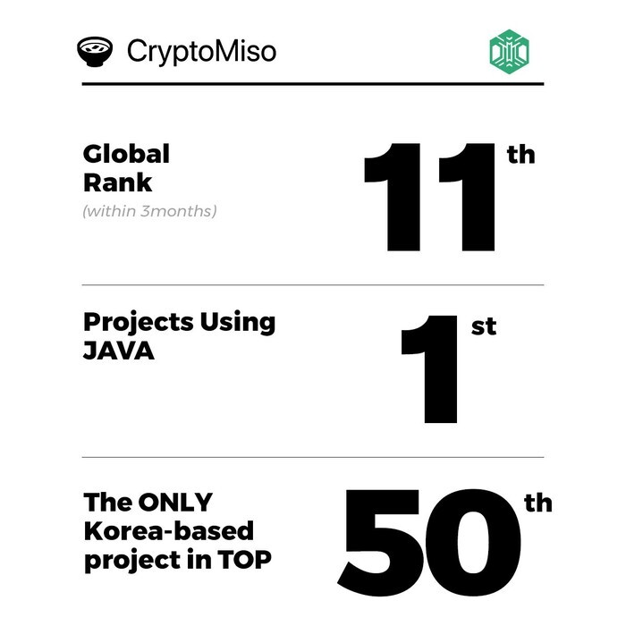 ‘크립토 미소’에는 1000여 개의 코인들이 등재되어 있으며, 이그드라시는 그 중 상위 11위를 기록, JAVA 언어를 쓰는 프로젝트 중에는 1위에 이름을 올렸다.