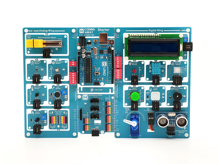 이 제품은 특히 아두이노 우노와 센서 및 엑츄에이터 모듈들이 보드 내 회로로 미리 연결되어 있어 , - 구분 및 점퍼 케이블(Jumper cable) 연결 없이 사용이 가능, 부품 분실 위험이 없고 코딩 교육 시 회로 연결 시간을 절약할 수 있으며 초보자나 초등학생도 안전하게 사용할 수 있다. 아두이노 코딩 어레이는 모듈 형태로 연결 혹은 분리돼 쉽게 배울 수 있으며 다양한 프로젝트에 활용할 수 있다.