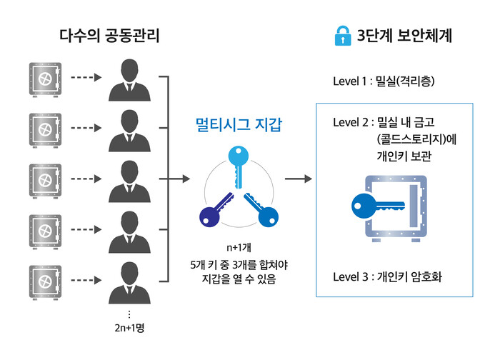 베네지아는 암호화폐 이동에 필요한 개인키를 1차로 암호화한 후 2차로 별도의 보안성 높은 콜드 스토리지에 보관한다. 해커가 공격해도 짧은 시간에 개인키를 찾아내기 힘들다. 멀티 시그는 다수가 암호화폐를 공동 관리하도록 해 안전성을 높이는 기술이다. 해커가 특정 개인키를 탈취하더라도 등록된 5개의 키 중 3개 이상의 키를 동시 호출해 서명해야 자산 제어가 가능하기 때문에 불법적인 암호화폐 이동을 원천적으로 방지한다.