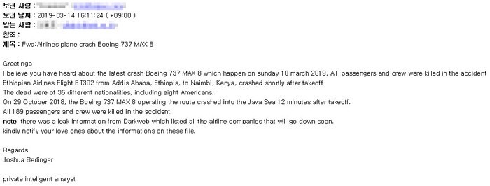 이번에 발견된 악성 메일에는 최근 발생한 '보잉737 맥스8 여객기 추락 사고’ 요약과 “다크웹에서 유출된(해당 기종을 이용하는) 위험 항공사의 리스트를 첨부했으니 주위 가까운 사람들에게 알려주어라”는 내용이 포함돼 있다. 이와 함께 ‘MP4_142019.jar’ 이름의 악성 자바 파일도 첨부되어 있다.