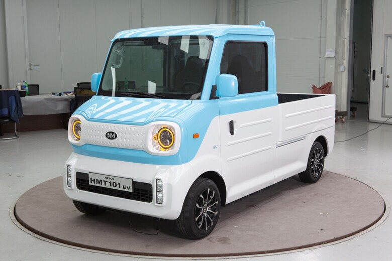 이번 전시회에서 첫 선을 보이는 전기화물차 HMT101은 단거리 배송에 실용적인 0.35톤급 초소형 화물차로, 슬라이딩 도어 방식을 채택, 좁은 골목에서도 승·하차가 편리하며, 고속 충전 이외에도 개인사업자들을 위해 가정용 충전기로도 3.5시간이면 완충할 수 있다.