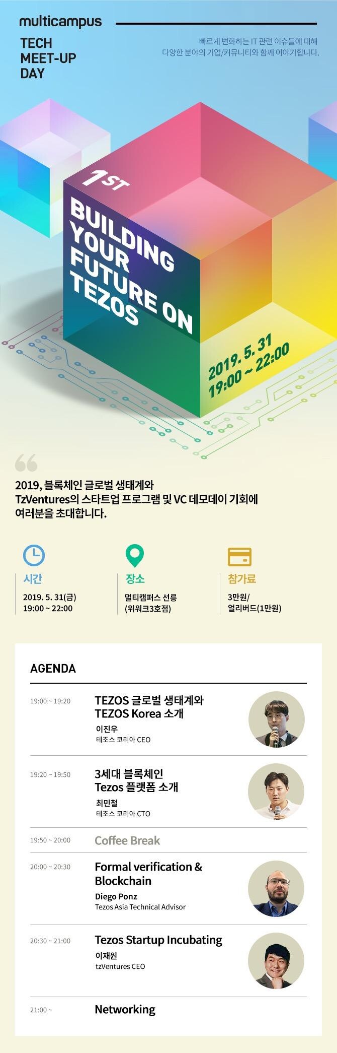 오는 5월 31일에는 멀티캠퍼스 제1회 테크-밋업인 “Building your future on Tezos”에서 테조스 코리아가 발표한다. 이 행사는 블록체인(Blockchain), 인공지능(AI), 사물인터넷(IoT), 빅데이터(BigData) 최신 이슈를 다루는 멀티캠퍼스 정기 행사로 1회 밋업에서 테조스 코리아는 플랫폼 생태계와 기술 특장점, 공개 교육과정, 테조스의 스타트업 인큐베이팅 프로그램(tzVentures)을 소개한다. 장소는 멀티캠퍼스 선릉 교육센터에서 진행한다.