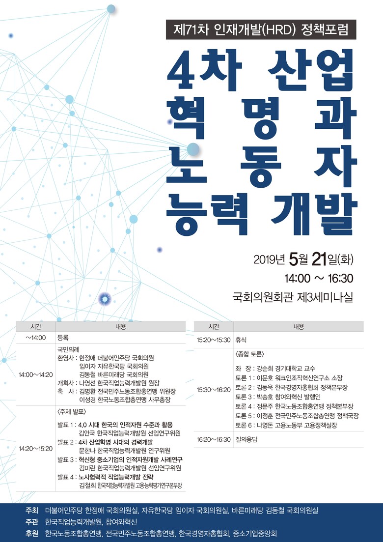 이번 제71차 인재개발(HRD) 정책포럼은 더불어민주당 한정애 국회의원실·자유한국당 임이자 국회의원실·바른미래당 김동철 국회의원실 등에서 공동 주최한다.