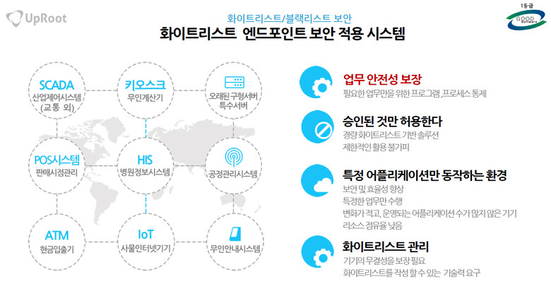 업루트에 따르면 화이트리스트 보안에서는 중앙관리가 핵심이다. 여기저기 흩어져 있는 조직의 컴퓨터나 기기를 쉽게 관리할 수 있고, 통제할 수 있어야만 조직의 소중한 정보를 지키는 진정한 화이트보안의 효과를 볼 수 있기 때문이다. 따라서 업루트의 화이트리스트 관련 특허는 화이트리스트 보안을 검토하고 있는 기업이나 기관에서는 한번쯤 검토해 볼 필요가 있다.