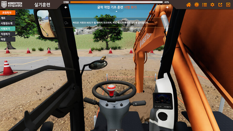 가상훈련 콘텐츠 중 ‘지게차 운전기능사실기’는 지게차 실기 코스를 가상공간으로 구현하여 실기시험 코스 숙지 및 운전능력 향상을 위한 반복훈련을 할 수 있다. ‘전기유압서보제어’는 유공압 제어훈련을 위한 유압회로 및 전기회로 설계 및 설치, 구동 훈련을 할 수 있으며 학습모드 훈련 후 사용자가 자유롭게 회로를 구성할 수 있는 실습모드도 제공하고 있다.