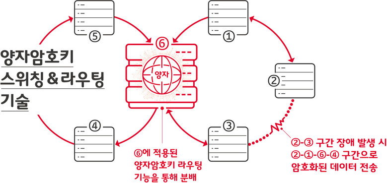SK텔레콤은 이번 과제를 통해 양자암호키 ‘스위칭’ 기술을 개발했다. 스위칭 기술은 한쪽 통신망에 장애가 발생 시 다른 방향으로 양자암호키를 전송하는 기술이다.