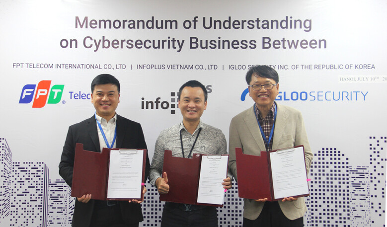이글루시큐리티가 베트남 1위의 ICT 기업으로 손꼽히는 FPT 와 함께 동남아시아 정보보안 시장 진출 기반을 마련한다. 차세대 통합보안관리 선도기업 이글루시큐리티(대표 이득춘)는 베트남 통신·IT 서비스 기업인 ‘FPT 텔레콤 인터내셔널(대표 PHAM DUY PHUC)’, 베트남 현지에서 활동하는 IT 인프라·보안·금융 솔루션 분야 전문기업인 ‘인포플러스(대표 김민호)’와 보안관제 사업 진행을 주요 골자로 하는 3자 양해각서(MOU)를 체결했다고 12일 밝혔다.
