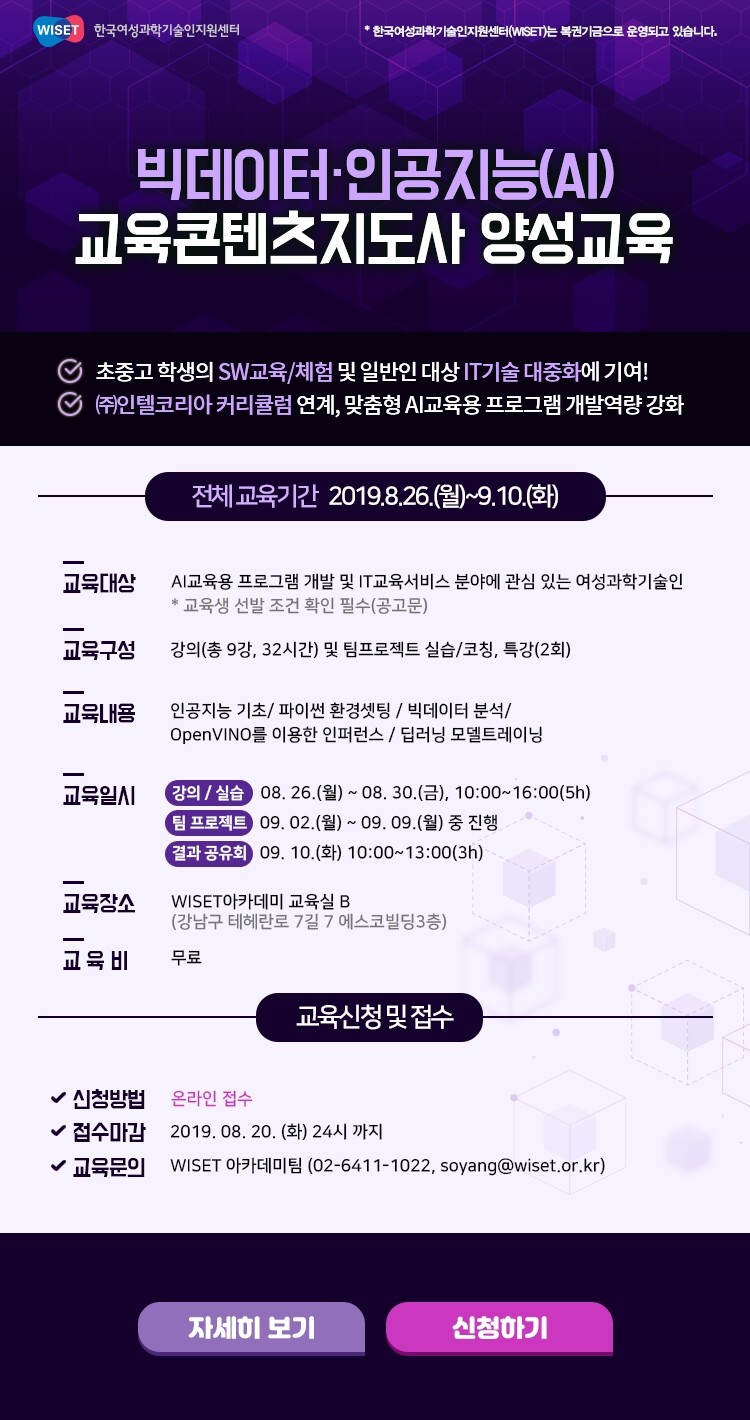 한국여성과학기술인지원센터(소장 안혜연, 이하 WISET)는 인텔코리아와 공동 추진하는 ‘빅데이터·AI 교육콘텐츠지도사 양성교육’ 수강생을 8월 1일부터 8월 20일까지 모집한다.