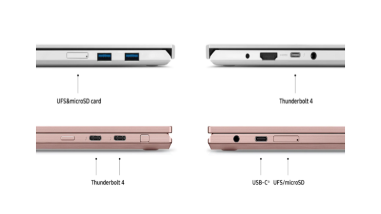 또 하나는 두 모델의 확장성의 차이다. 갤럭시 북 플렉스 2는 썬더볼트4 2개, USB-C 1개, UFS/MicroSD 슬롯, 헤드폰단자로 구성되어 있다. 갤럭시 북 이온 2는 썬더볼트 4 1개, USB 3.0 2개, UFS/MicroSD 슬롯, 풀 사이즈 HDMI 1개, 헤드폰 단자로 구성되어 있다. 이를 통해 플렉스 2는 태블릿 형태의 멀티 디바이스이고, 이온 2는 노트북에 가까운 제품임을 알 수 있다.