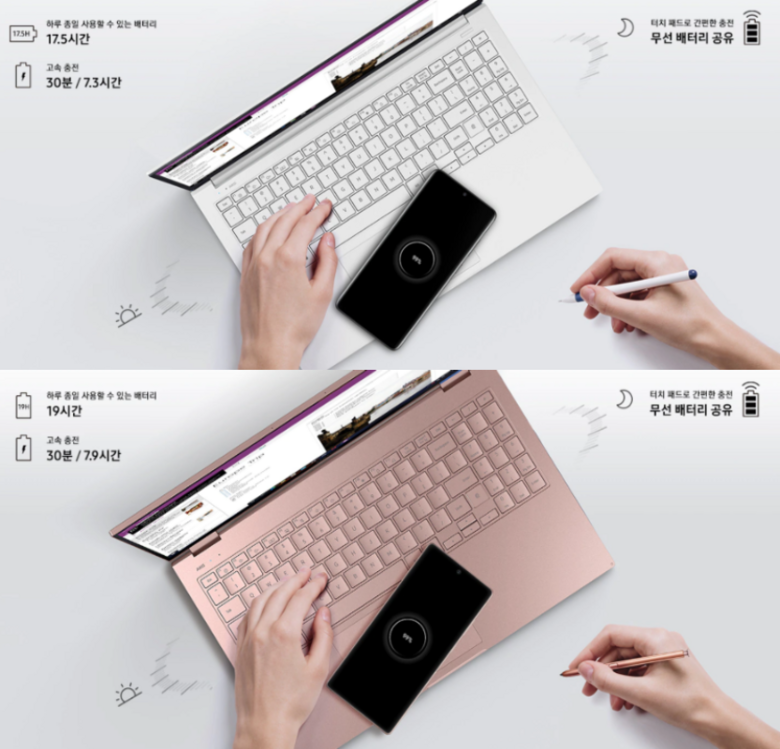 갤럭시 북 플렉스 2는 한번의 완충으로 19시간을 사용할 수 있고, 이온 2는 한번의 완충으로 17.5시간을 사용할 수 있다. 또한 두 제품 모두 무선 충전을 할 수 있는 ‘무선 배터리 공유 기능’을 공유하고 있다.