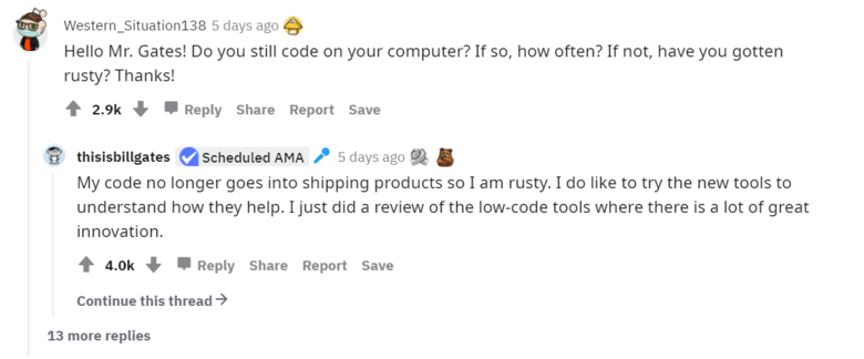 빌 게이츠는 "내 코드가 더 이상 제공되는 제품에 들어가지 않아서 녹슬었다"고 밝혔다. 그는 "저는 새로운 툴이 어떻게 도움이 되는지 이해하기 위해 사용해보는 것을 좋아합니다. 저는 단지 훌륭한 혁신이 많이 있는 저코드(low-code) 도구들을 검토했습니다."고 덧붙였다.