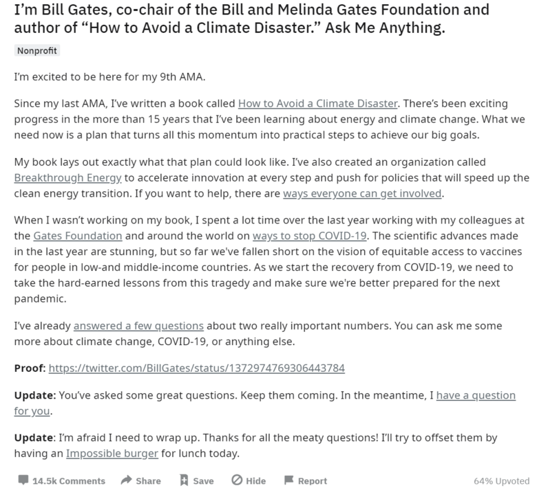 AMA 세션에서 빌 게이츠는 합성 육류(인공 고기, 대체육), 전기 자동차 등 다양한 주제에 대해 다뤘다. 틈새 기술의 중요성에 대한 견해를 밝히며 "우리는 합성 육류, 에너지 저장, 새로운 건축 재료 제조 방법 등 많은 기술이 필요합니다. 우리는 엉뚱해 보이는 아이디어에 개방적이기 원합니다. 퓨전은 생겨날 수 있지만, 그것을 기대할 수 없습니다."라고 말했다.