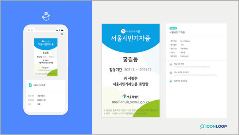 본 서울시민기자증은 블록체인을 통해 발급되어 위변조 및 허위 발급이 불가능하며, 발급된 기자증은 DID 신원인증 서비스 ‘쯩’으로 간편하게 확인 및 제출이 가능하다. ‘쯩'은 아이콘루프가 개발한 블록체인 기반 DID 신원인증 서비스로 금융위원회 혁신금융서비스로 지정되어 국내 최초 금융권 DID 발급, 제주형 관광방역 시스템 ‘제주안심코드' 등에 활용되고 있으며, ICT 규제 샌드박스를 통해 향후 모바일 운전면허증도 탑재할 예정이다.
