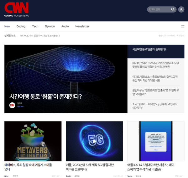 IT, Tech, 코딩, 블록체인, 최신 트렌드 등 다양한 주제를 한 번에 만나고 싶다면 코딩월드뉴스 홈페이지를 활용해보자. 기사, 카드뉴스, 오디오 등 코딩월드뉴스의 모든 콘텐츠를 한 곳에서 확인할 수 있다.
