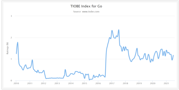 Go의 연도별(Very Long Term History) 점유율은 2021년 3월 가장 높았다. Go는 2009년과 2016년에 올해의 프로그래밍 언어(Programming Language of the Year)로 선정되기도 했다.