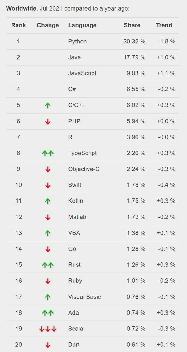티오베 지수는 구글, 빙, 위키피디아 같은 검색 엔진에서 언어 검색을 검사하는 공식을 기반으로 한다. 이 수식은 언어와 관련된 숙련된 엔지니어, 학습 과정, 써드파티 업체의 수를 평가한다. PyPL은 구글에서 얼마나 자주 언어 자습서를 검색하는지를 분석하는 지표이다.