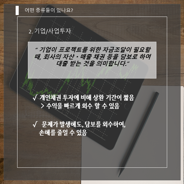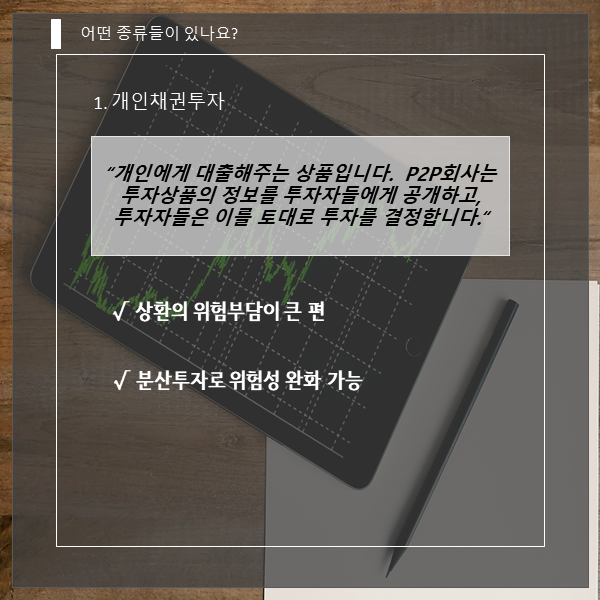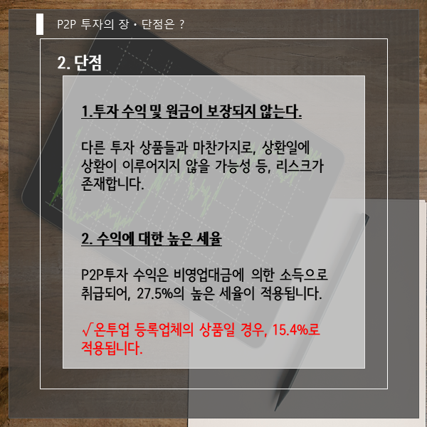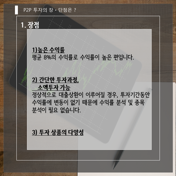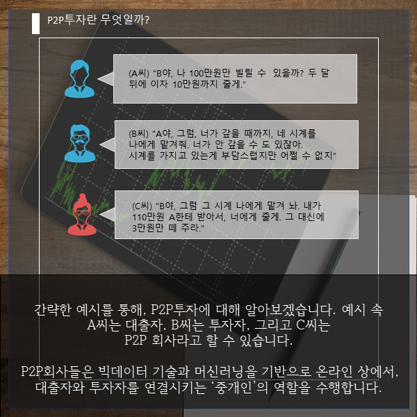 요즘 금융과 IT 기술을 접목한 새로운 금융 형태인 핀테크가 주목받고 있습니다. 대표적인 핀테크 사례 중 하나인 P2P투자에 대해 카드뉴스로 소개합니다.
