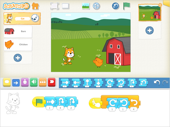 스크래치 주니어는 어린 학습자를 위한 앱으로 플레이스토어에서 구입할 수 있다. 아이들은 대화식 이야기와 게임 만들며 프로그래밍하는 방법을 학습할 수 있다.