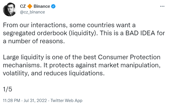 FTX 최고경영자(CEO) 샘 뱅크먼 프리드도 '일부 국가들이 독립 오더북(호가창)을 원하는데, 이는 잘못된 것'이란 바이낸스 CEO 자오창펑 의견에 동의한다는 뜻을 밝혔다.