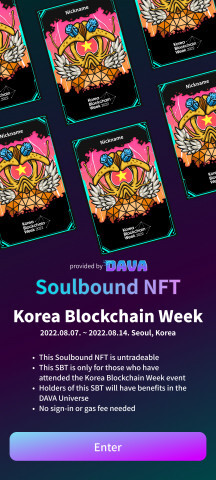 행사 현장에 방문한 참관객은 자신의 NFT 이미지를 활용해 자신만의 고유의 SBT를 만들 수 있다. 또한 다바 SBT를 보유한 지갑은 9월 클로즈베타 버전으로 출시할 예정인 DAVA의 게임 ‘DAVA Eternal : The Beginning’에서 혜택을 받을 수 있다.