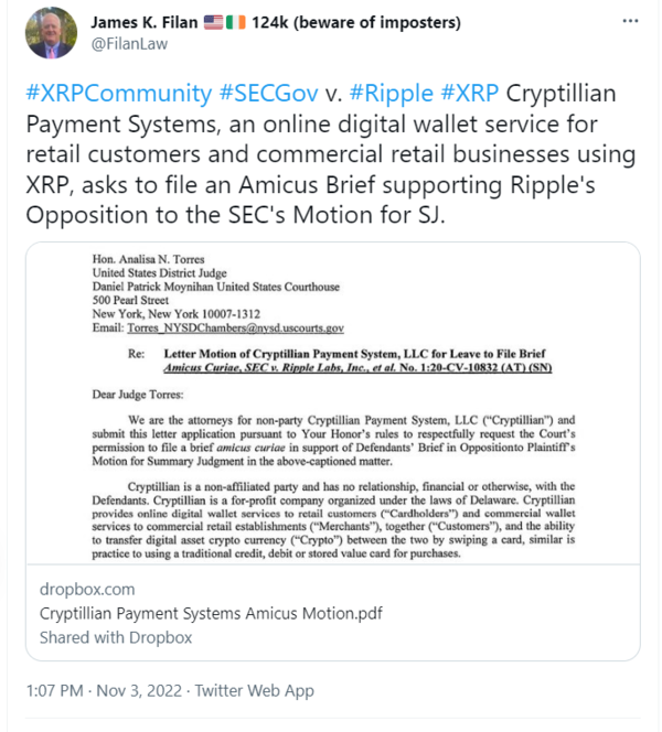 디지털 월렛 서비스업체 크립틸리안 페이먼트 시스템이 미국 증권거래위원회(SEC)와 '미등록 증권 판매' 소송을 진행 중인 리플을 지지하기 위해 아미쿠스 브리프(Amicus Briefs) 제출을 법원에 신청했다.