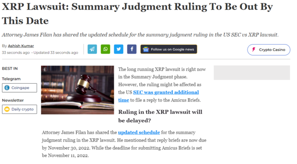 아미쿠스 브리프는 법원의 판단에 도움을 주기 위해 전문가 단체 등 제3자가 해당 사건에 대한 견해를 전달하는 것을 의미한다. 앞서 코인니스는 리플과 SEC가 약식 재판 관련 답변서(the reply briefs) 제출 기한을 기존 11월 15일에서 11월 30일로 15일 연장하는 데 합의했다고 보도한 바 있다.