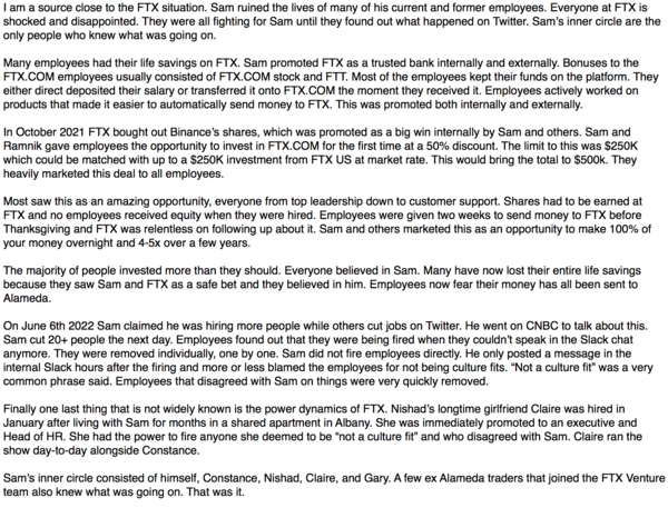 FTX 직원으로 밝혀진 한 내부자가 "샘(SBF, FTX 창업자)은 FTX 직원들의 삶을 망쳤다. FTX 임직원들은 충격과 실망에 빠져있다. 다수의 직원들은 FTX에 전재산을 보관했었다"고 말했다.