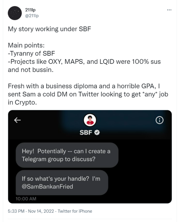 14일(현지시간) 211lp는 트위터를 통해 "암호화폐 업계에서 일하고 싶어 SBF에게 DM을 보냈고, 세럼(SRM) 프로젝트의 텔레그램 커뮤니티 관리자가 될 수 있었다. 당시 SRM 프로젝트에서 성과를 보여 승진할 수 있었고 SBF, FTX, 솔라나(SOL)가 주축인 새로운 프로젝트 본피다(FIDA)의 BD 총괄을 제안받기도 했다"고 밝혔다.