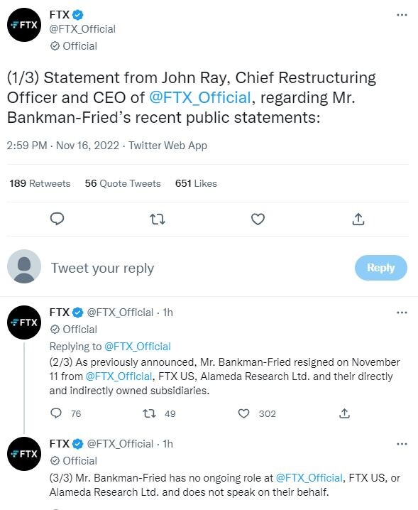 이와 관련해 코인데스크는 "최근 SBF는 잇따라 트윗을 올리고 뉴욕타임스 등 미디어와 인터뷰하고 있다. 이러한 SBF의 잦은 논평이 FTX의 CRO(최고구조조정책임자)로부터 냉담한 반응을 이끌어냈다"고 평가했다. 존 레이는 최근 사임한 SBF를 대신해 CEO 직을 맡은 인물로, CRO이기도 하다.