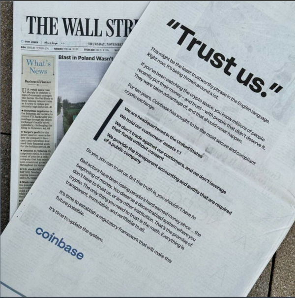 'TRUST US'라는 제목의 광고에는 "수 백만 명의 사용자가 아무런 자격도 없는 사람들에게 돈과 신뢰를 보냈다. 그 결과, 사용자는 이용 당했다. 이런 일은 결코 일어나서는 안 됐다. 지난 10년 동안 코인베이스는 가장 안전하고 규정을 준수하는 암호화폐 거래소가 되기 위해 노력해왔다"고 전했다.
