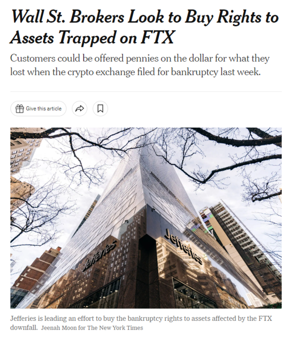 19일(현지시간) 뉴욕타임스는 "월가 브로커들은 FTX에 묶인 피해자들의 현금 및 암호화폐에 대한 청구권을 구매하기 위해 피해액보다 할인된 금액에 채권 인수를 시도하고 있으며, FTX에 묶인 자산의 잠재적인 가치를 평가하기 위해 전문 인력을 배치하고 있다"고 보도했다.