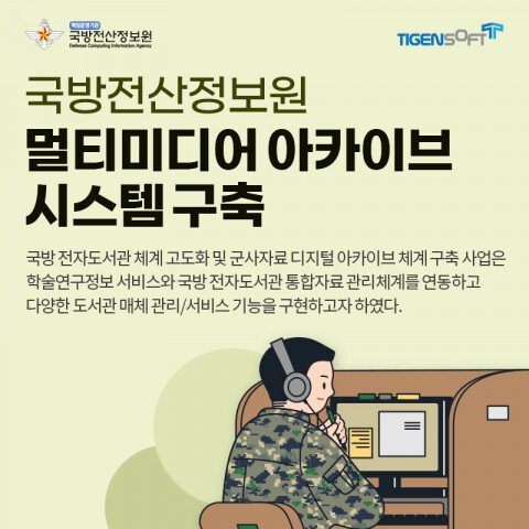 멀티미디어 아카이브 시스템 및 통합 메시지 전송 솔루션 개발, 판매 전문 기업 티젠소프트(대표 고훈호)가 국방전산정보원 ‘국방 전자도서관 체계 고도화 및 군사자료 디지털 아카이브 체계 구축’ 사업에 멀티미디어 콘텐츠 통합 관리 아카이브 시스템(TG 1st MCMS Archive)을 성공적으로 구축했다고 밝혔다.