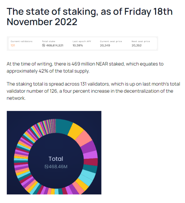 레이어1 블록체인 프로젝트 니어(NEAR) 재단이 주간 투명성 보고서를 통해 "11월 18일 기준 4.69억 NEAR 토큰이 스테이킹 상태에 있다. 이는 NEAR 토큰 총 공급량의 42% 규모"라고 밝혔다.