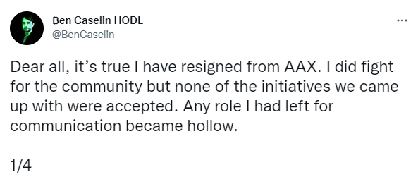 최근 출금 중단한 암호화폐 파생상품 거래소 AAX의 벤 캐실린(Ben Caselin) 부사장이 트위터를 통해 "AAX 부사장직에서 사임했다"고 밝혔다.