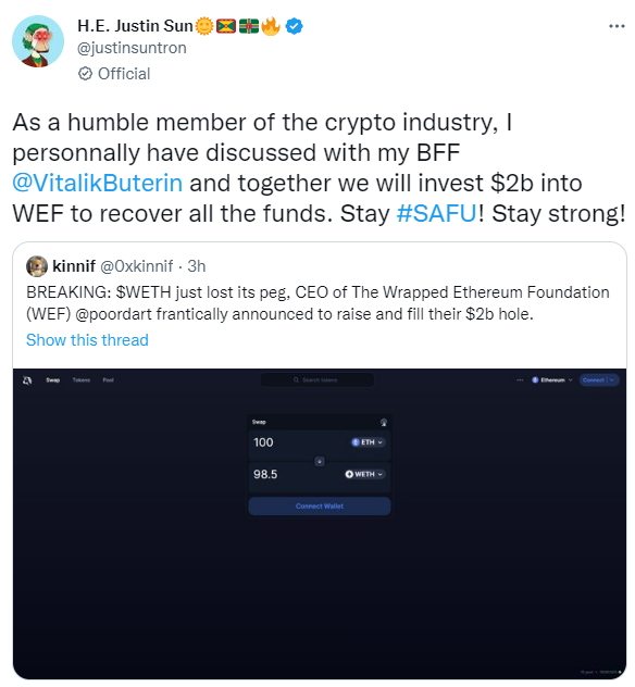 트론(TRX) 설립자 저스틴 선이 WETH 디페깅 현상과 관련 트윗을 링크하며 "이 문제와 관련해 개인적으로 싱가포르 기반 벤처캐피털 블록체인 파운더 펀드(Blockchain Founders Fund, 이하 BFF), 비탈릭 부테린 이더리움 창시자와 논의했다"고 전했다.