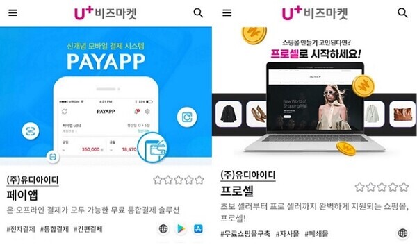 U+비즈마켓은 LG유플러스가 제공하는 기업용 솔루션을 소개하고 이용할 수 있는 사이트다. U+비즈마켓을 통해 페이앱과 프로셀이 제공하는 서비스를 소개하고 간편 상담 등도 제공할 예정이다.