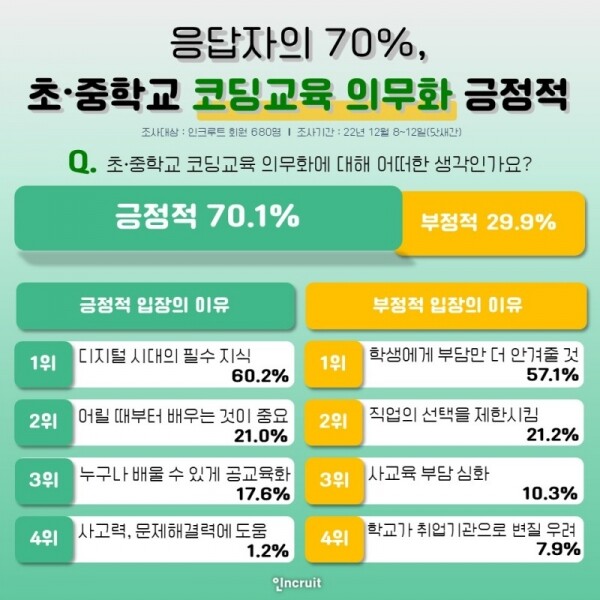 인크루트는 초·중학교 코딩교육 의무화와 선행학습에 대한 설문조사를 진행했다.