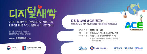 테크빌교육이 오는 겨울방학 동안 전라남도 도서벽지 학교 초·중·고 학생을 대상으로 소프트웨어(SW)·인공지능(AI) 교육 캠프인 ‘디지털 새싹 캠프’를 진행한다고 5일 밝혔다.