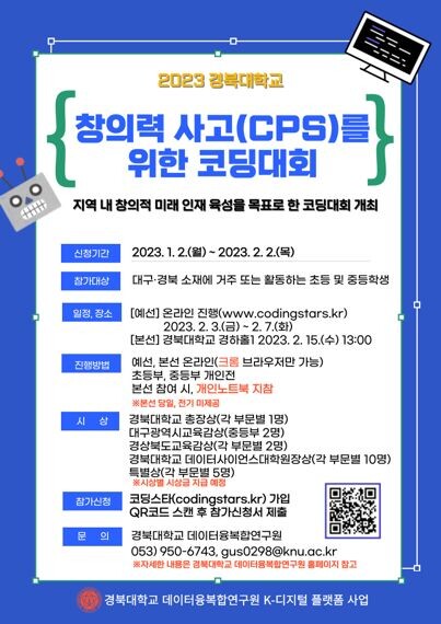 7일 경북대 데이터융복합연구원에 따르면, 고용노동부 지원사업으로 K-디지털 플랫폼을 운영하면서 지주소프트와 함께 대구·경북 소재에 거주 또는 활동하는 초등학생과 중학생 대상으로 '2023 경북대학교 창의력 사고(CPS)를 위한 코딩대회'를 개최한다.
