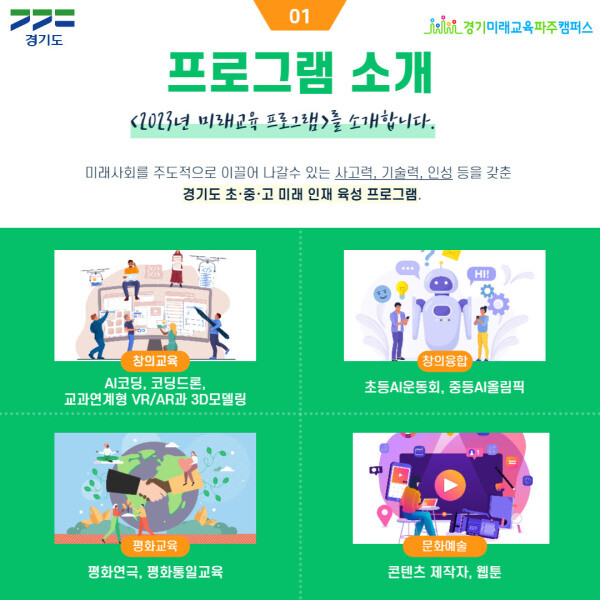 경기도평생교육진흥원 경기미래교육 파주캠퍼스(이하 캠퍼스)가 27일부터 오는 3월 6일까지 경기도 청소년 대상으로 인공지능(AI) 코딩과 웹툰 등을 교육하는 '미래교육' 참가자를 모집한다.